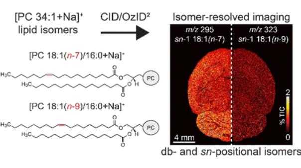 組織內(nèi)脂質(zhì)的質(zhì)譜成像(MSI)在生物分子發(fā)現(xiàn)和組織病理學(xué)應(yīng)用方面具有重要潛力。然而,傳統(tǒng)的MSI技術(shù)受到了磷脂區(qū)域異構(gòu)體的普遍存在的挑戰(zhàn),這些異構(gòu)體僅在碳-碳雙鍵的位置和/或脂肪酰基與甘油主鏈的相對(duì)位置(即sn位置)上有所不同。成像實(shí)驗(yàn)中無(wú)法解析異構(gòu)體脂質(zhì)掩蓋了潛在的復(fù)雜性,導(dǎo)致代謝信息的嚴(yán)重丟失。在此,臭氧誘導(dǎo)解離(OzID)在能夠進(jìn)行基質(zhì)輔助激光解吸/電離(MALDI)的遷移率啟用四極飛行時(shí)間(Q-TOF)質(zhì)譜儀上實(shí)現(xiàn)。利用Q-TOF中的離子遷移區(qū),獲得了高數(shù)量密度的臭氧,導(dǎo)致∼與早期MALDI OzID實(shí)施相比,OzID產(chǎn)物離子豐度提高了1000倍。將這種提升轉(zhuǎn)化為成像導(dǎo)致采集率提高了50倍,有助于磷脂異構(gòu)體分辨率的大面積繪圖。繪制大鼠腦切片的異構(gòu)體分布圖揭示了脂質(zhì)異構(gòu)體群體的不同分布,其雙鍵和sn位置不同的異構(gòu)體的區(qū)域特異性關(guān)聯(lián)。此外,由臭氧和碰撞誘導(dǎo)的連續(xù)離解產(chǎn)生的產(chǎn)物離子在非經(jīng)典sn-1位置酯化的不飽和脂肪酰基鏈中實(shí)現(xiàn)了雙鍵分配。