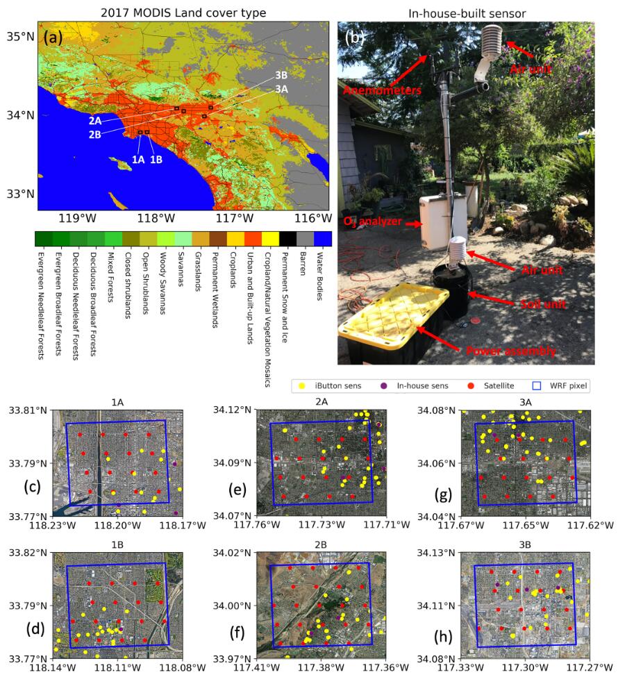 我們?cè)O(shè)計(jì)了我們的研究,以評(píng)估2017 年夏季從單個(gè)地塊到洛杉磯大都市區(qū)(圖 1a )的多個(gè)尺度的溫度和 O 3變化。我們圍繞單個(gè)社區(qū)組織了傳感器部署,我們將其定義為 4 × 4 km 2樣方. 密集的現(xiàn)場(chǎng)部署集中在加利福尼亞州長(zhǎng)灘和內(nèi)陸帝國(guó)的各個(gè)部分(圖 1c-1h),這是洛杉磯大都市地區(qū)的一個(gè)子集,嚴(yán)重未達(dá)到 O 3. 部署持續(xù)時(shí)間分為三個(gè)活動(dòng)。在 2017 年 6 月至 7 月的第一次活動(dòng)中,六個(gè)傳感器節(jié)點(diǎn)被分布到長(zhǎng)灘附近距離小于 20 公里的兩個(gè)樣方(每個(gè)樣方三個(gè)傳感器節(jié)點(diǎn))(例如,圖 1中的樣方 1A 和 1B) . 通過(guò)這種設(shè)計(jì),樣方大小可與空氣質(zhì)量模型和 EPA 排放清單的標(biāo)稱空間分辨率相媲美,后者通常為 4 × 4 km 2,而兩個(gè)樣方之間的距離可與 TROPOMI 足跡的尺寸相媲美( 4 × 7 公里2) 在更低點(diǎn)。因此,社區(qū)科學(xué)網(wǎng)絡(luò)的分布非常適合進(jìn)行測(cè)量,以解決有關(guān)亞網(wǎng)格尺度模型不確定性和亞像素分辨率衛(wèi)星檢索不確定性的問(wèn)題。2017 年 7 月至 8 月的第二次活動(dòng)和 2017 年 8 月至 9 月的第三次活動(dòng)的部署與第一階段的部署類似,但針對(duì)克萊蒙特(圖 1中的 2A 和 2B )和圣貝納迪諾(3A)附近的不同樣方和3B),分別。當(dāng)兩個(gè)樣方在項(xiàng)目的每個(gè)階段配對(duì)以測(cè)量子區(qū)域梯度預(yù)期溫度和 O 3時(shí),項(xiàng)目所有三個(gè)階段中的鄰域?qū)Χ急贿x擇以共同反映區(qū)域梯度。
